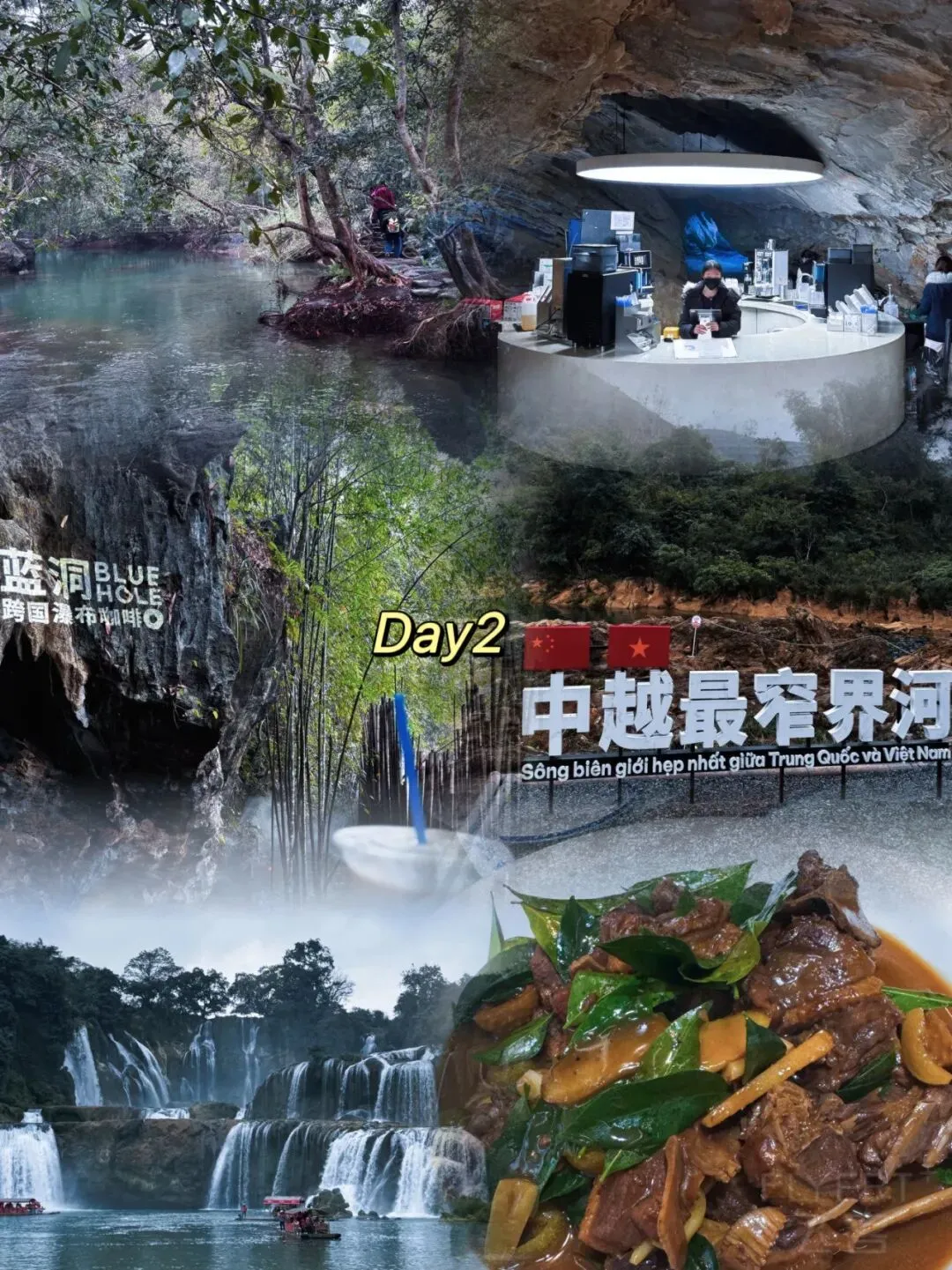 🚗Day2:跨国瀑布 秘境探幽 德天跨国瀑布必须冲!乘竹筏近距离感受水雾扑面,超震撼!下午蓝洞瀑布咖啡、伏那秘境。