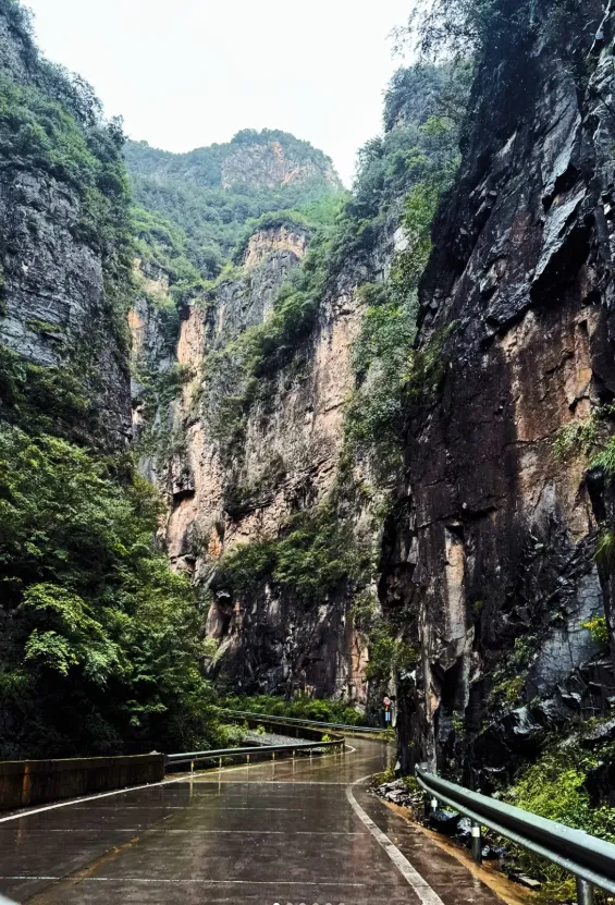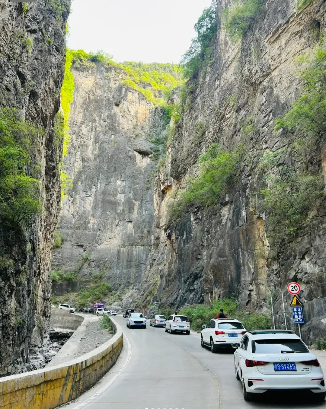 太行深处的原生态峡谷,两侧绝壁高耸、怪石嶙峋,峡谷幽深狭长,车行其间,仿佛穿梭于大地裂缝之中,惊险又震撼。绝壁对峙、天光一线,溪水潺潺穿谷而过,春日绿意铺满崖壁,尽显太行峡谷的雄奇险峻。