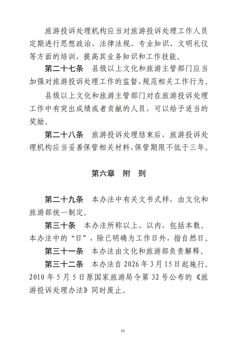 (中华人民共和国文化和旅游部令第14号公布 《旅游投诉处理办法》已经2025年12月29日文化和旅游部部务会议审议通过,自2026年3月15日起施行。)