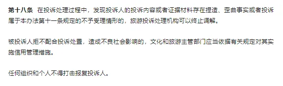 《办法》第十八条明确,投诉人投诉不实,旅游投诉处理机构可以终止调解,切实保障旅游企业的合法权益;增加对不配合投诉处置的企业实施信用管理的措施,有利于营造“守信光荣、失信可耻”的良好运营环境,提高全行业守信经营水平,进而提升旅游者满意度,推动行业高质量发展。