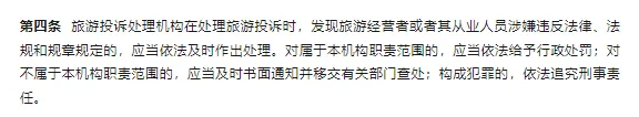 第四条区分“属于本机构职责范围”“不属于本机构职责范围”“构成犯罪”3种情形,明确不同情况的处理方式,有利于避免“各扫门前雪”的情况,增强部门间的协作,以“全流程的投诉处理制度”让涉及多部门的投诉得到及时有效的处理,可以更好将旅游者权益保障落到实处。
