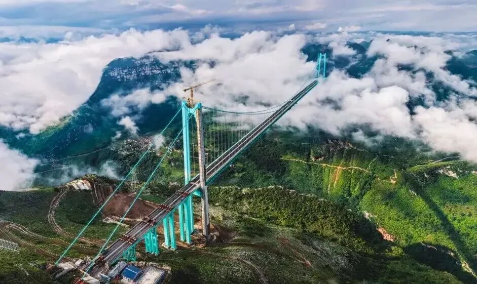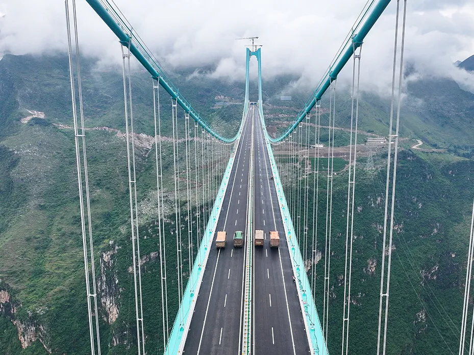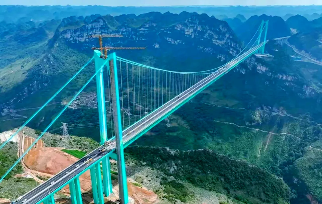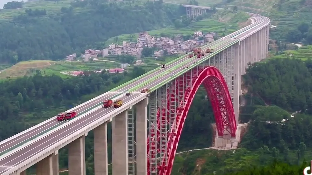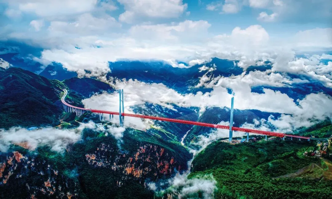 关兴公路北盘江大桥:桥面距江面486米,是同类桥梁中的中国第一、亚洲第二,采用双向预应力砼加劲板梁设计,展现了现代桥梁建筑的雄伟壮观。