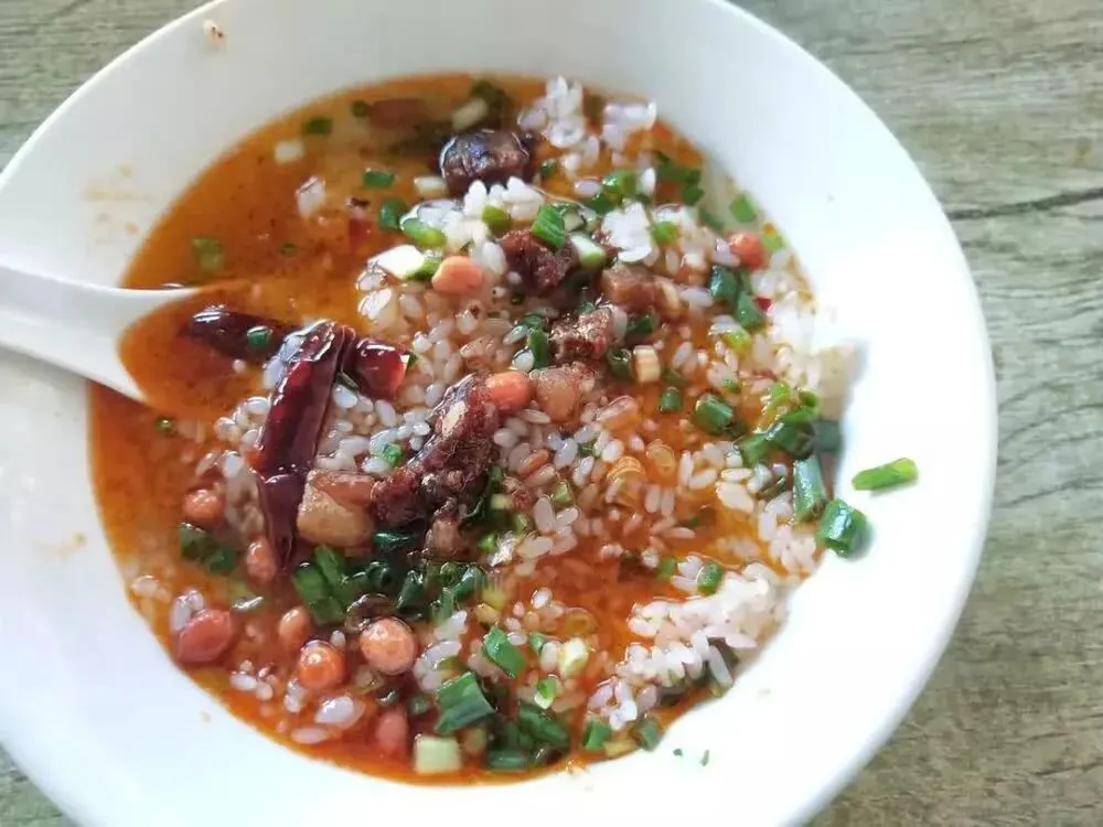 5、三合汤:糯米饭、四季豆米、酥肉片熬制,汤色清澈鲜美。