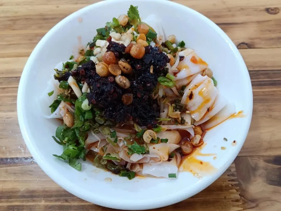 7、安龙剪粉:精选优质大米制成薄如纸、白如雪的粉皮,剪成块状后加入葱花、香菜、酸菜、折耳根、西红柿汤、花椒油等十余种调料。