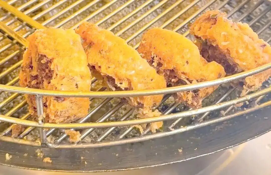 9、盒子粑(油炸鸡蛋糕):以大米和黄豆磨浆为皮,包裹鲜猪肉丝、葱花、胡椒粉等馅料,油炸至金黄酥脆。