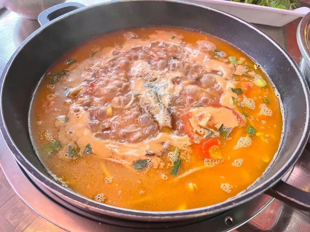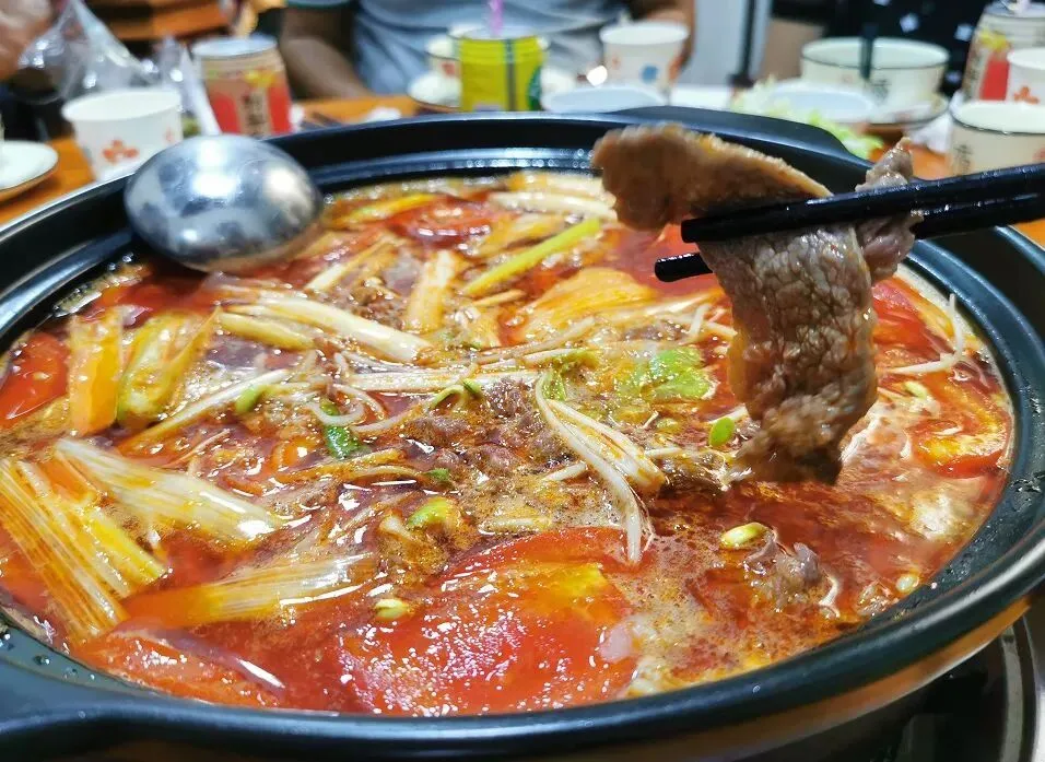 10、酸笋牛肉火锅:以酸笋、酸辣椒和本地小番茄熬制锅底,牛肉鲜嫩,酸香扑鼻,越煮越爽。