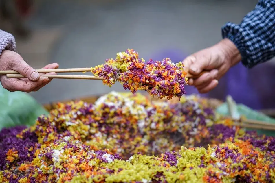 13、五色糯米饭:用天然染料(如枫叶、蒙密花、紫米草、苏木)将糯米染成黑、黄、紫、红四色,与白糯米共煮。