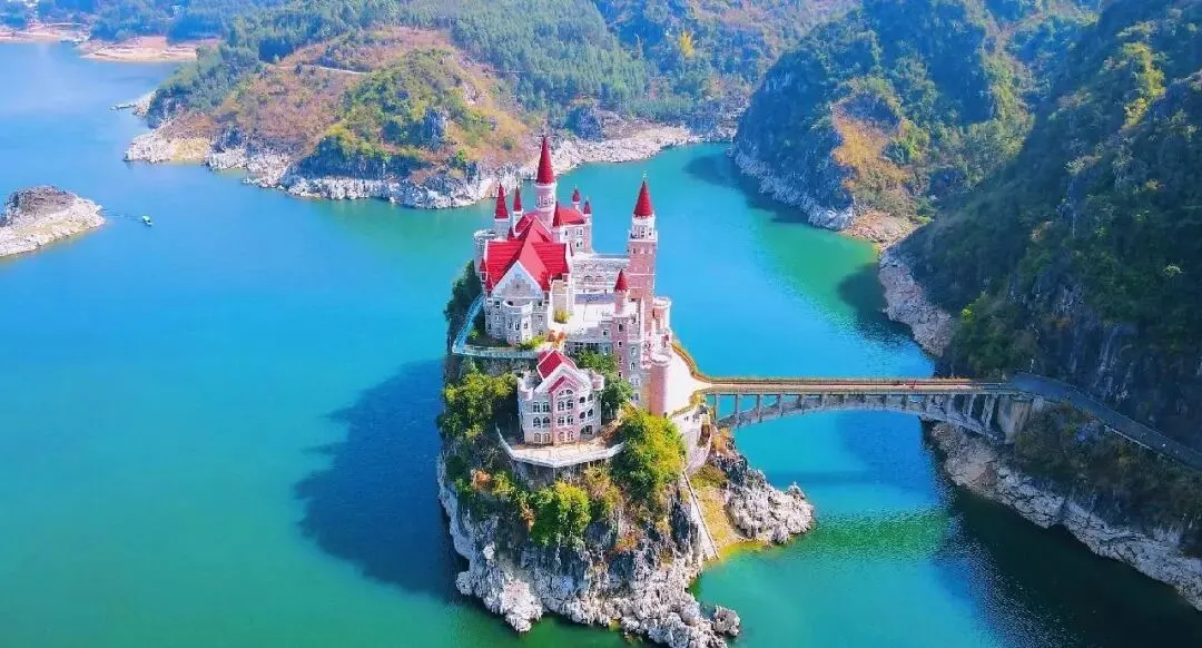 吉隆堡:位于万峰湖内,是一座环湖而建的城堡。其独特的地理位置和欧式建筑风格吸引了无数游客前来探访。城堡外部以红白色为主,高低错落,被怪石嶙峋的喀斯特地貌包围,独立于万峰湖中,仅有一桥连接。内部精美的壁画、高耸的罗马柱、瑰丽的摆件,更是吸引了无数摄影爱好者和游客前来打卡。