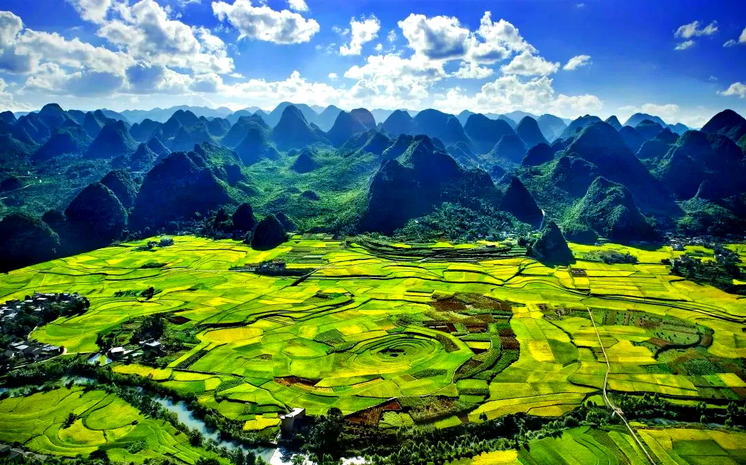 特色:由上万座锥状喀斯特山峰组成,被誉为“中国锥状喀斯特博物馆”。徐霞客曾赞誉其“天下山峰何多,唯有此处峰成林”。景区内田园风光与峰林相映成趣,夏季绿意盎然,秋季金黄稻田与山峰交织成画。
