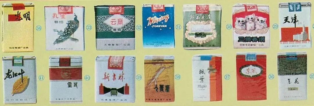 画册中共介绍了14款香烟,其中黄盒人参烟和新吉林香烟为吉林省生产。新吉林香烟标价0.49元/盒,人参烟标价1.1元——人参烟是14款中最贵的。由于小时候玩过“烟喷儿”,见过好多种在吉林销售的香烟,因此其他12种的——0.9元的天津烟、0.6元的卫星烟、0.9元的金花烟、0.95元的灵芝烟、0.7元的龙江叶……看着都不陌生。