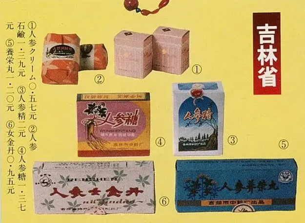 除了研究之外,日用品和药品也是画册编辑认可的伴手礼。上图中六种特色商品: “人参クリーム”即“人参乳膏”,“人参石鹼”即“人参香皂”虽然看不清厂名厂址,但结合《吉林特产风味指南》一书的介绍,这两种应该是吉林市日用化学品工业公司生产的“绯丽系列人参化妆品”(也有可能是这个系列的前身)。人参系列日用品长期是吉林名牌,很早就是国内日化行业的先进新产品,行销国内外。 人参精 、人参糖 、 養栄丸(养荣丸)均为吉林市中药厂生产。吉林市中药厂即今吉林国药制药有限责任公司的前身,该厂成立于1956年。在当时“一化三改”运动中,在东北“药行”久负盛名的“世一堂”、“永德堂”、“志诚利”等十余家药店的“后厂”人员组成了中药生产企业,即吉林市中药厂。这家药厂的产品品质极佳,在国内外久负盛名。除画册中提到的三款药品外,当年的“定心丹”也极受日方欢迎。酒类中的参茸虎骨药酒也是这家药厂的产品。 人参女金丹也是吉林市所产。尽管厂名字迹模糊,但依稀可辨识出是“吉林市特产研究所制药厂”。这家工厂位于左家镇,是今吉林特研药业有限公司前身。
