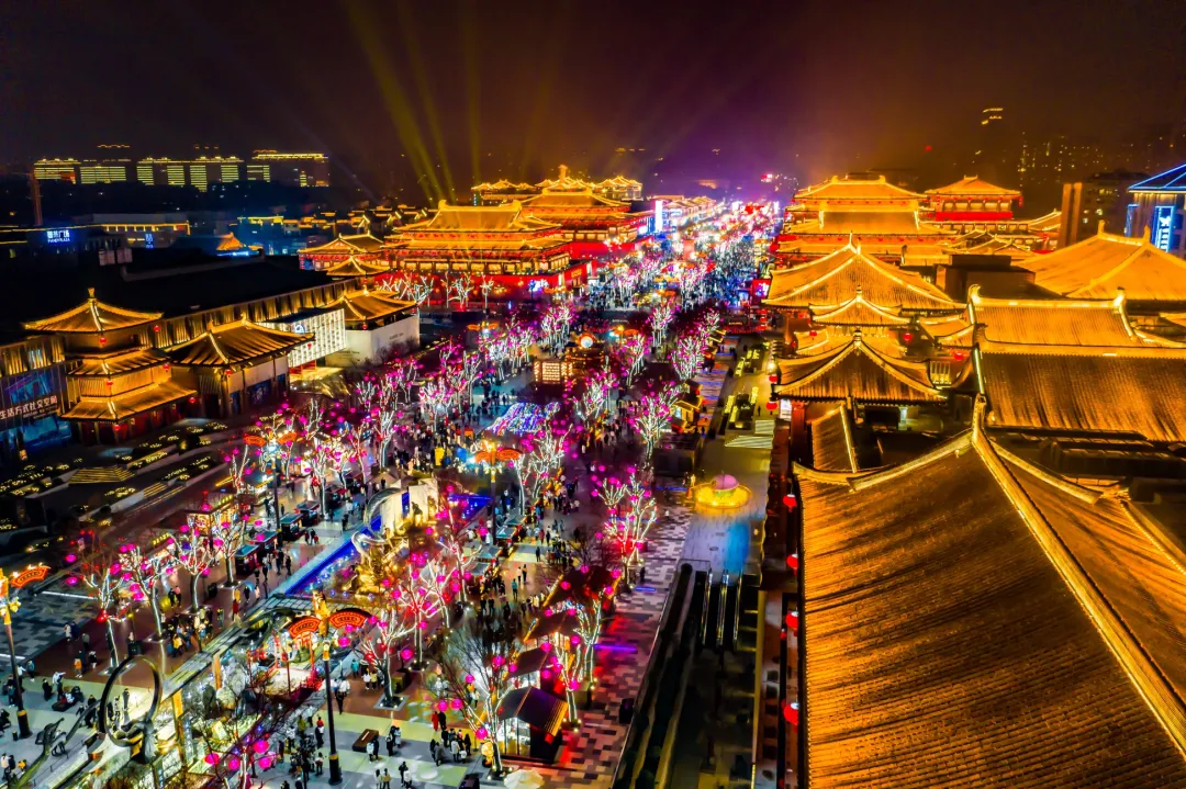 春日的大唐不夜城,少了冬日的寒凉,多了几分温柔。华灯初上,灯火璀璨,仿唐建筑被灯光勾勒得轮廓分明,不倒翁小姐姐的裙摆随风摆动,街头艺人弹唱着《西安人的歌》,穿着汉服的姑娘提着灯笼走过,恍惚间穿越回盛唐🌌