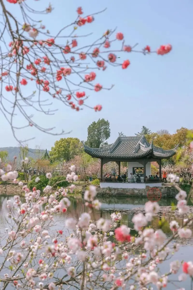 蠡园:碧水绕着亭台,桃花开得正盛,深红浅红缀满枝头,与古桥、回廊相映成趣。漫步园中,桃红柳绿,一步一景,江南水乡的温婉,全藏在这里。