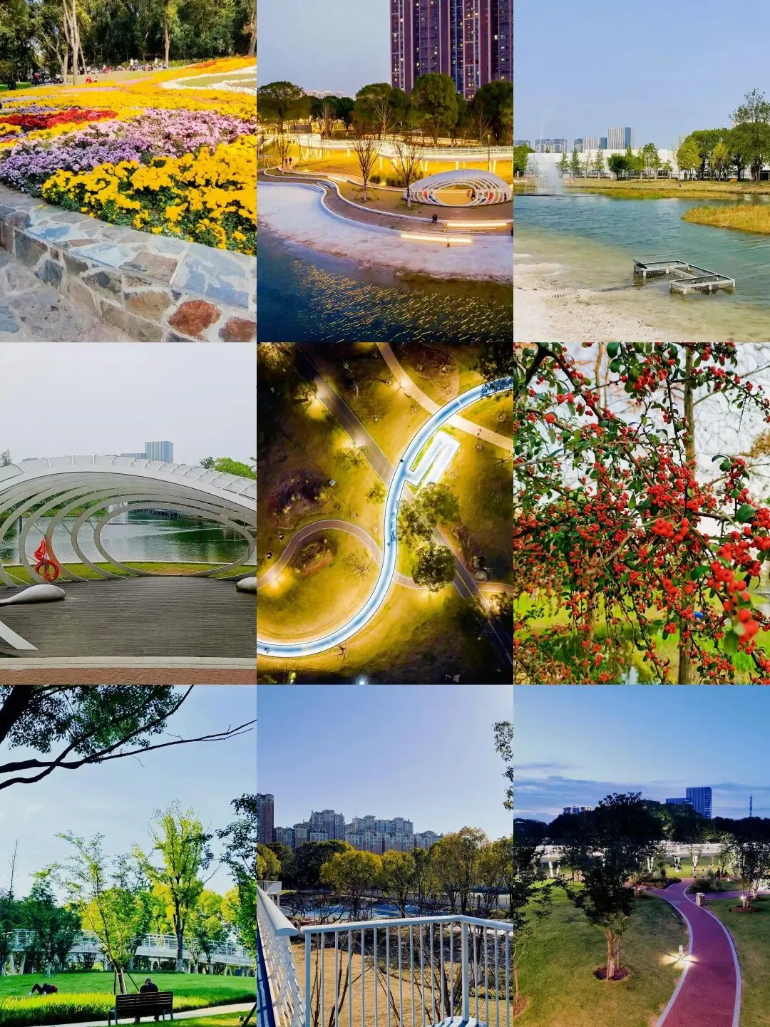 惠山新城中央公园:地铁 1 号线直达,蓝色步道嵌着花形图案,喷泉、白沙滩、滑滑梯,遛娃超合适;草坪上还能露营,晒着太阳,看云卷云舒,惬意又自在。