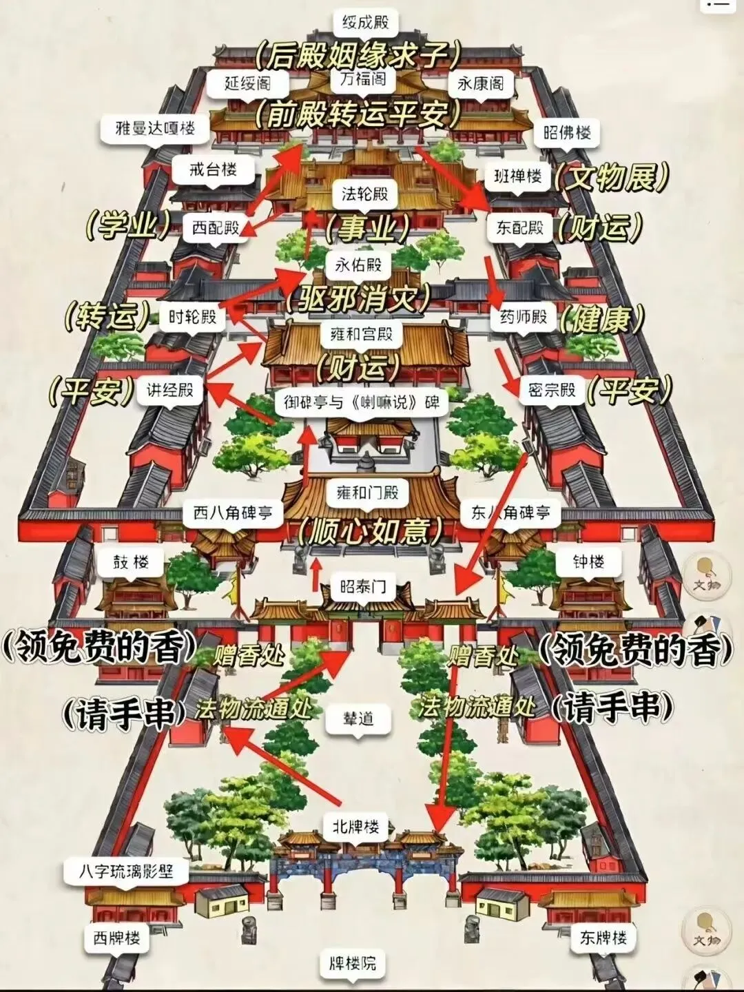 中轴线精华路线:昭泰门→天王殿(求顺心)→雍和门殿(求财)→永佑殿(消灾)→法轮殿(事业)→万福阁(平安/姻缘)→绥成殿(吉祥)。
