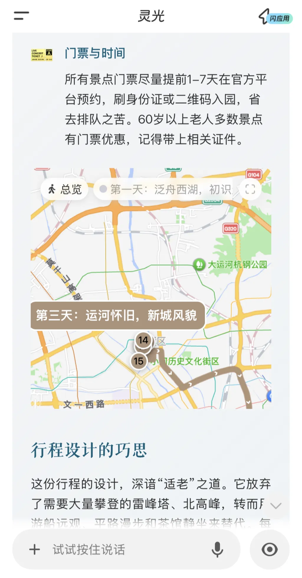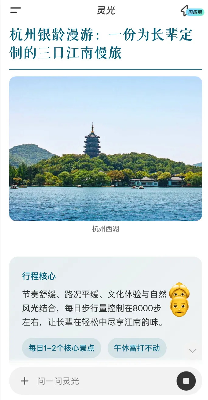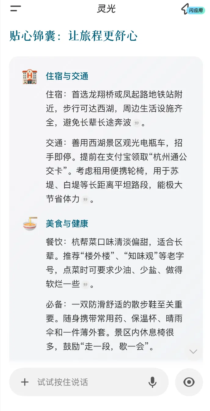 示例话术:“灵光我想去杭州玩三天,帮我做个适合老年人的轻松点的攻略”说完后点击发送,灵光会立刻 “思考”,几秒就能生成一份完整的专属旅游攻略!