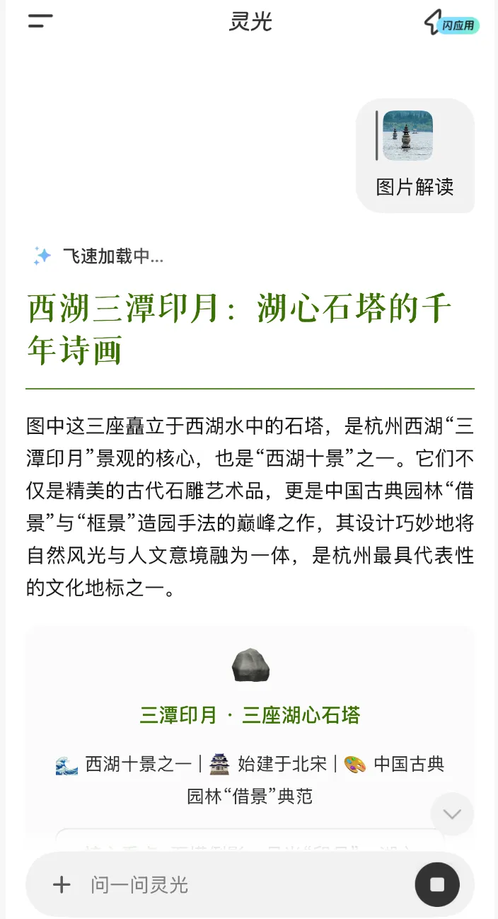如果您在旅游景点,想了解背后的历史故事、传说趣事,或者想知道这个景点的打卡小技巧?灵光化身随身携带的 AI 导游,随时为你讲解: