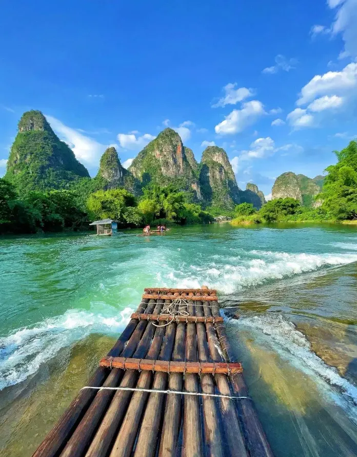 漓江的水清澈得像一面镜子,倒映着两岸如笋般的青山;泛舟其上,真的有种“舟行碧波上,人在画中游”的错觉。