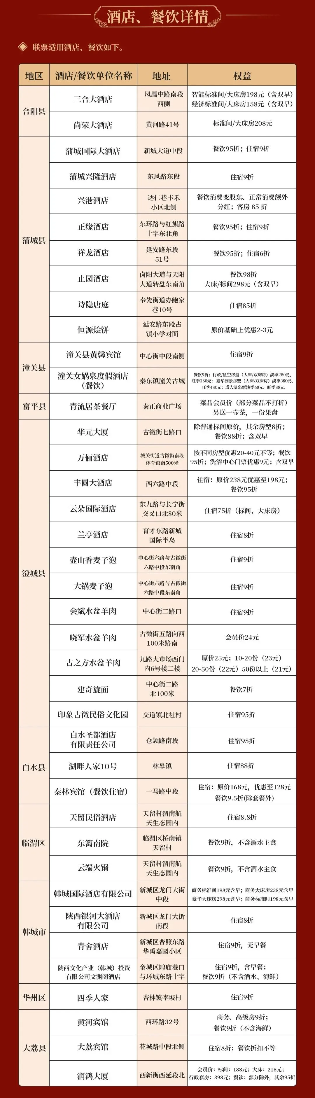 合作商户覆盖渭南各县市区,既有品质酒店,也有地道风味餐馆,让你享受“一张票通行,吃住游全包”的便捷体验。无需再费心寻找优惠,一张联票在手,全程省钱又省心。