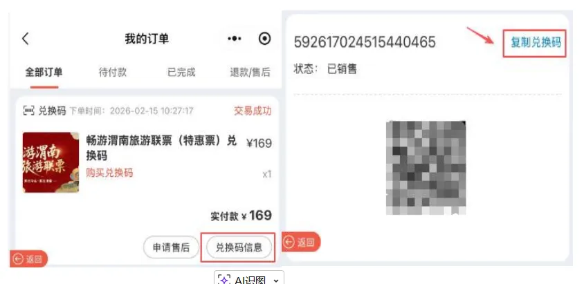 若在“畅游渭南景区直通车”小程序购买,可在“订单查询”中获得兑换码。