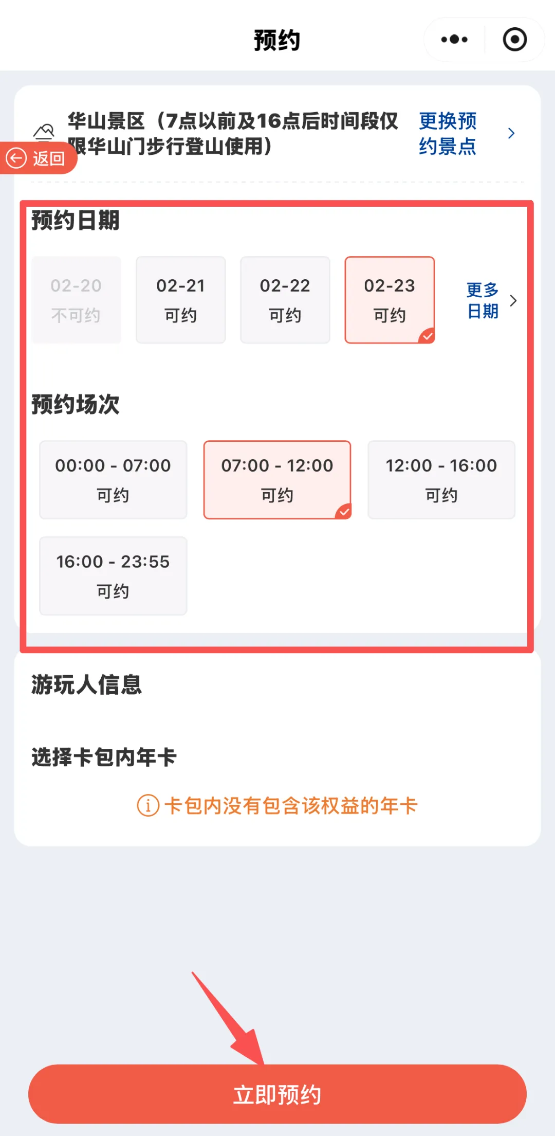 ✅预约游玩:在“畅游渭南景区直通车”微信小程序-“畅游渭南旅游联票”购票页面-“华山预约入口”-点击“立即预约”-选择“华山景区”-选择游玩日期和时段并进行预约。