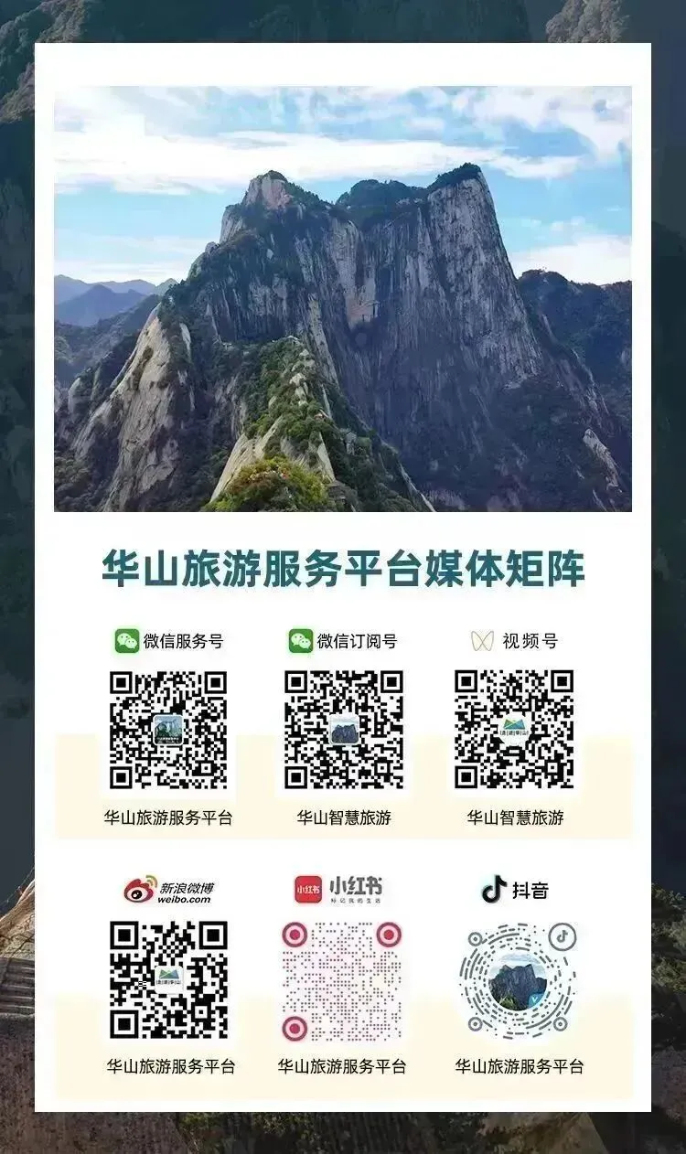 ✅购票平台:“华山旅游服务平台”微信公众号、“畅游渭南景区直通车”微信小程序,以及合作渠道(携程、美团、抖音)。
