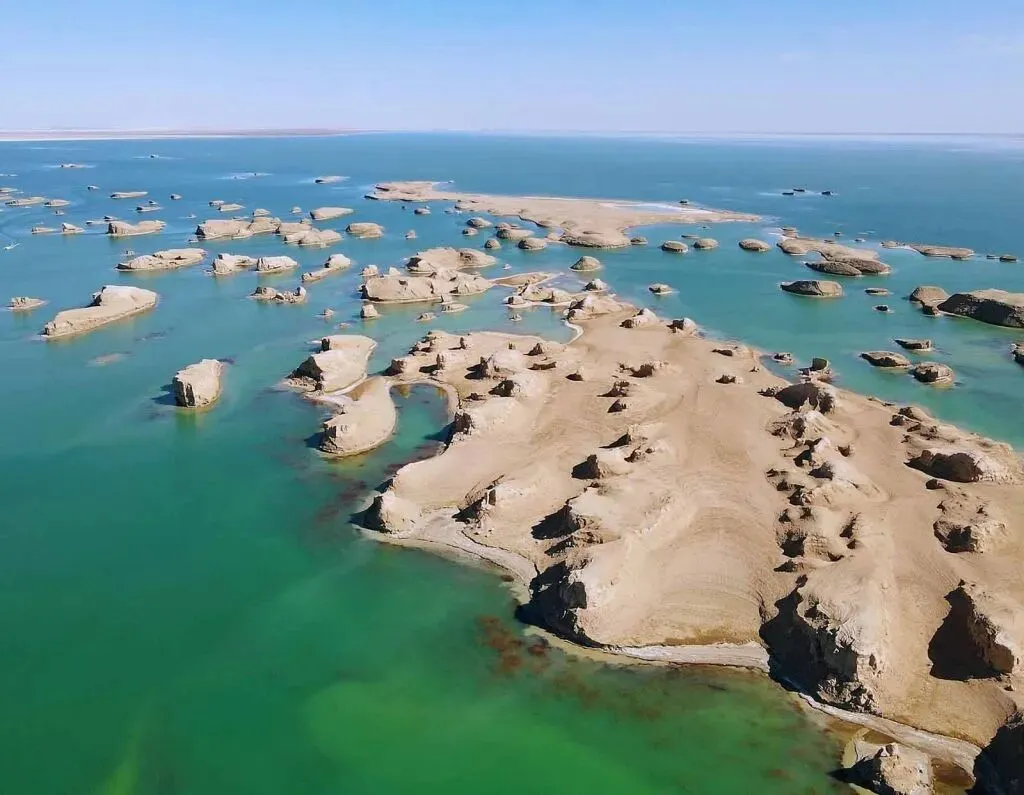 这里的雅丹体造型独特,有的像 "军舰",有的像 "城堡",被形象地称为 "西海舰队"。傍晚时分,落日余晖洒在雅丹与湖面上,金光闪闪,氛围感极强。千万年风蚀形成的雅丹群落矗立于碧绿盐湖中,远观如舰队出海,近看则似外星城堡。