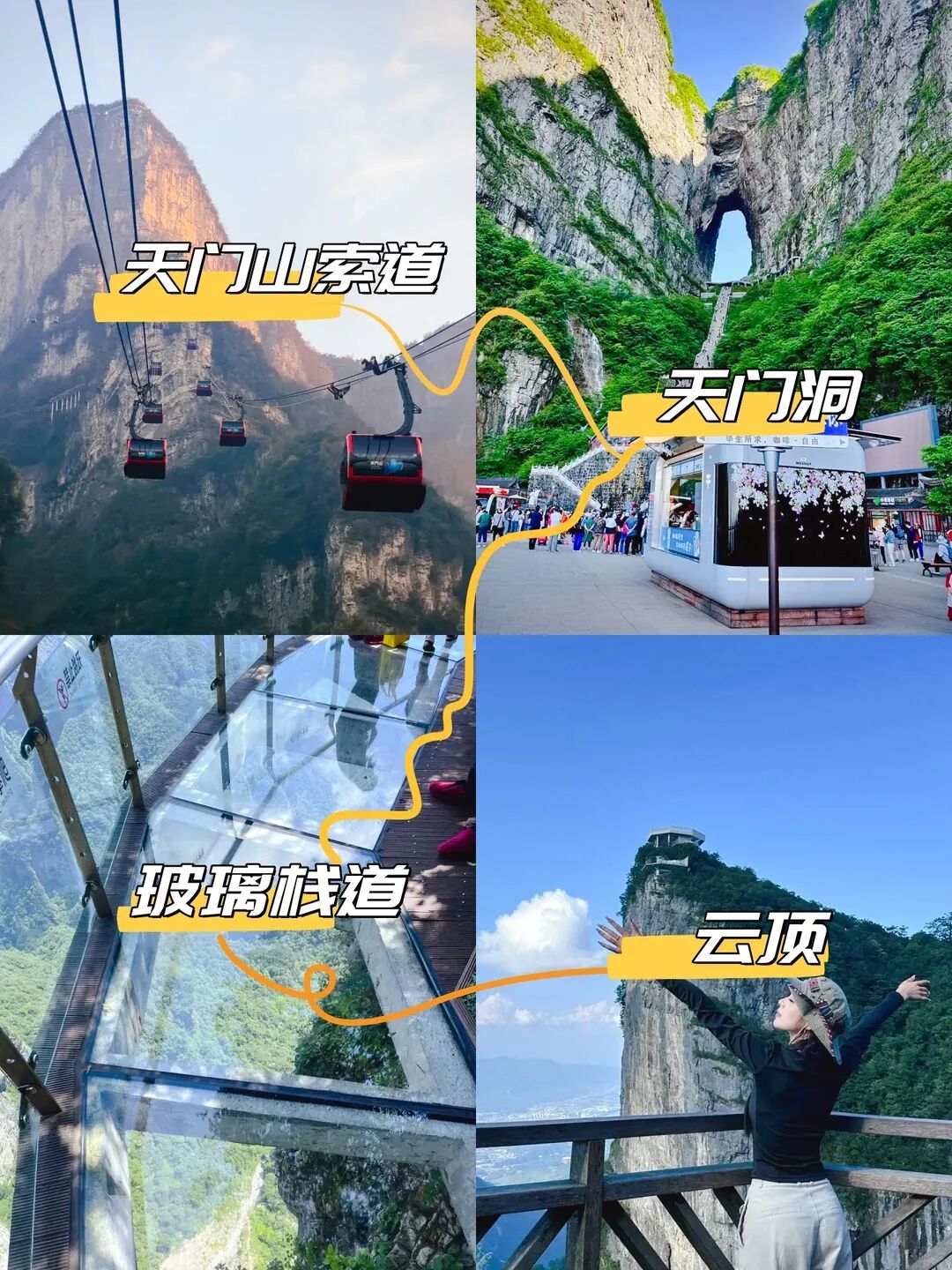 第3天:金鞭溪→天门山。早上不用起太早,8点多出发去金鞭溪,溪水清澈见底,两岸峰林倒映在水里,树荫茂密,走在里面特别凉快,堪比天然氧吧,走累了还能坐在溪边歇一歇。偶尔能看到野生猕猴,小纤反复提醒我们,千万别投喂、别伸手,避免被抓伤(亲眼看到有人伸手喂猴子,被抓伤了,特别麻烦)。我们没走全程,只走了精华路段,打卡神鹰护鞭、千里相会,全程1个多小时,轻松不费力,不用累得腿软。中午吃完午饭,去天门山,我们选的是最省时的A线(索道上山、环保车下山),坐7455米的世界最长高山索道上山,脚下是翻涌的云海,又惊险又浪漫,恐高的闺蜜全程抓紧我的手,但还是忍不住感叹风景绝了。走玻璃栈道的时候,虽然腿有点软,但脚下的深渊和云海交织,那种感觉太特别了,鞋套费5元自理,不算贵,性价比很高。最后打卡天门洞,远眺999级天梯,不得不感叹大自然的鬼斧神工,逛完天门山,小纤就送我们回民宿休息,节奏刚刚好。