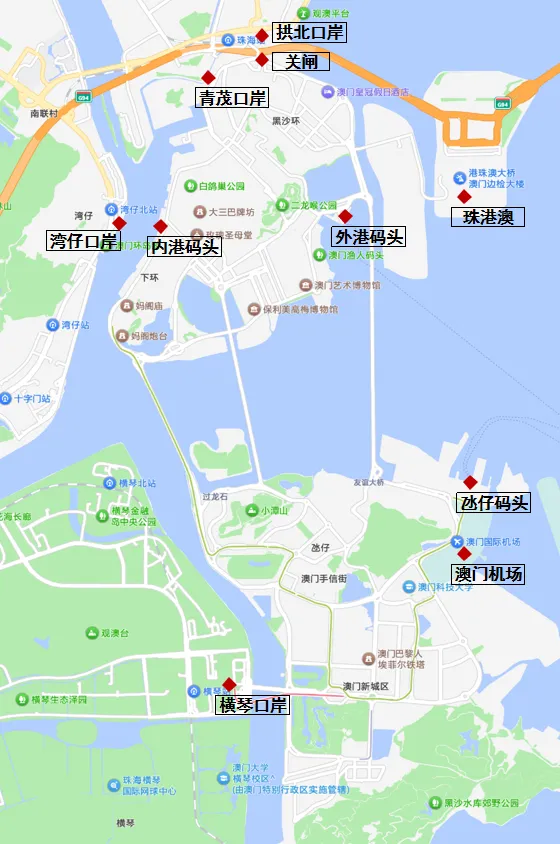 珠海→澳门:陆路步行过关,拱北口岸(6:00-次日1:00,近老城区)、横琴口岸(24h)、青茂口岸(24h);水路过关,湾仔口岸(7:00-22:00,到澳门内港码头,近大三巴,30分钟一班,坐船5分钟,船票25)