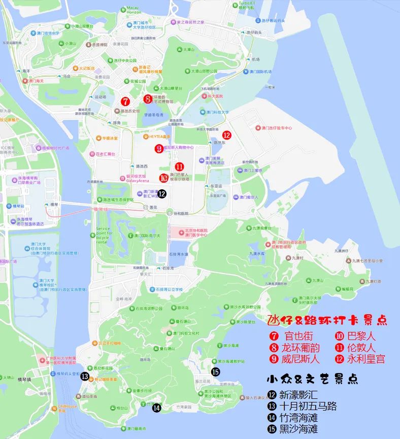 (氹仔、路环主要景点分布图)