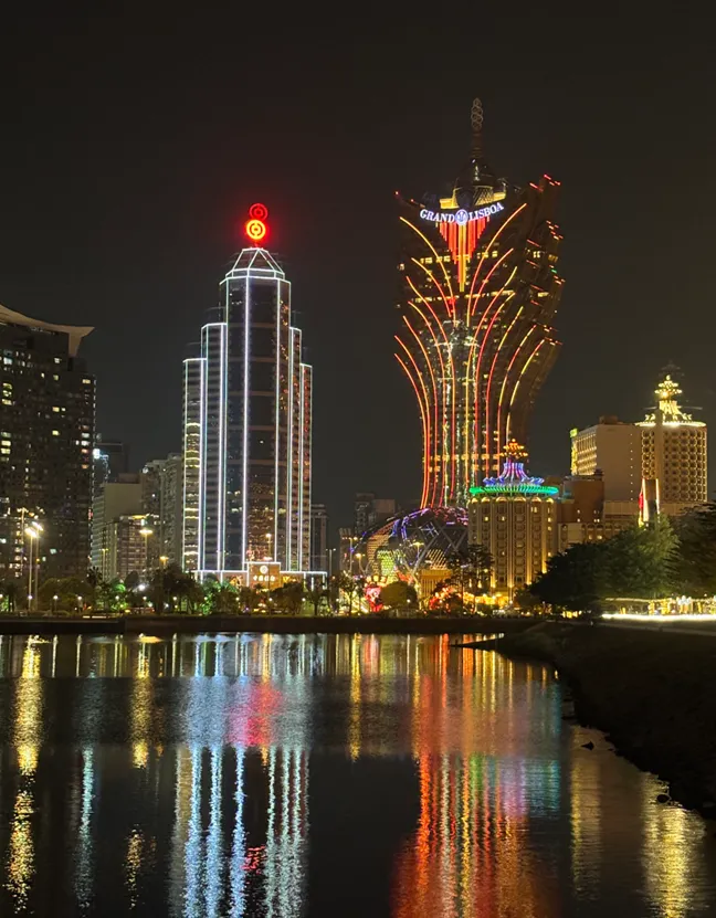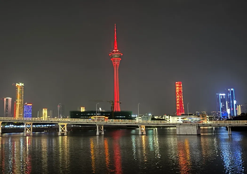 澳门(英文名Macao,葡语Macau),古称濠镜澳,由澳门半岛、氹(dang)仔、路环、路氹填海区组成,陆地面积仅33.3平方公里,只有香港的3%,常住人口68.8万。澳门是世界四大赌城之一,是中国人均GDP最高的城市,2025年人均约52.9万(成都只有11.5万),官方语言文字是中文和葡文。