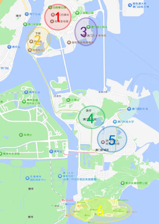 澳门景点可划分为六大片区,1大三巴片区、2妈祖阁片区(还未打卡)、3渔人码头片区、4官也街片区、5奢华度假村片区、6路环岛片区。
