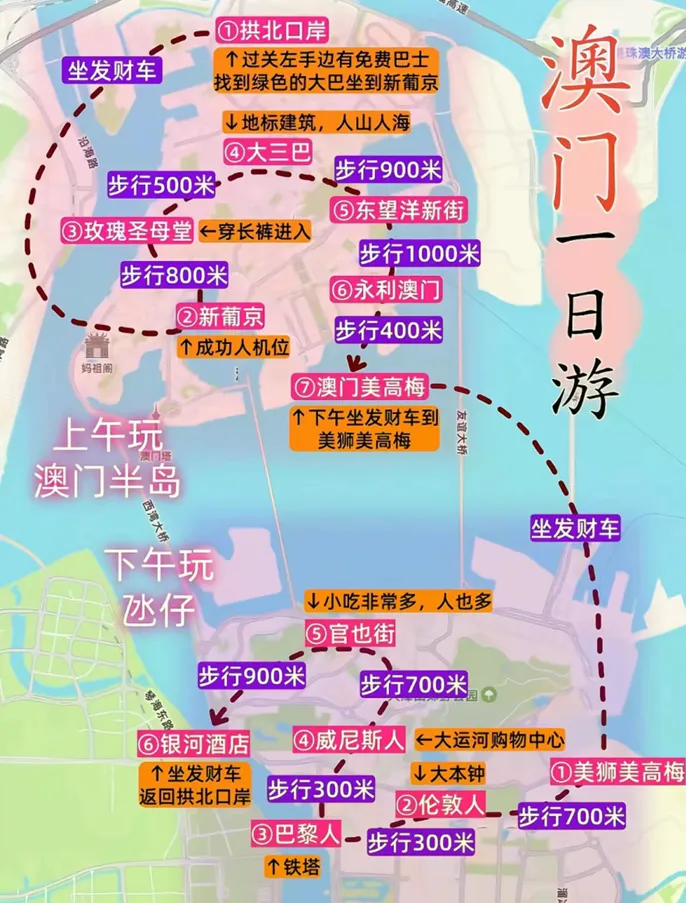 一日游:首选必打卡景点组合,大三巴片区+官也街片区/渔人码头片区/妈祖阁片区+奢华度假村片区;如果时间紧,建议直接走:大三巴片区+奢华度假村组片区