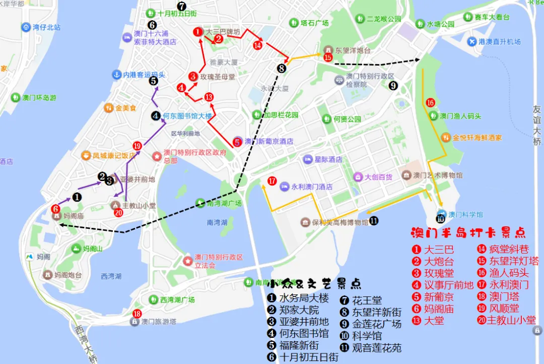 两日游:必打卡景点为主+感兴趣的推荐打卡景点;大三巴片区+渔人码头片区/妈祖阁片区+官也街片区+奢华度假村片区