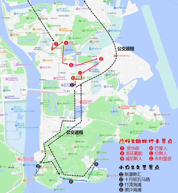⚠️永利皇宫缆车16:00后乘坐,音乐喷泉要20:00场最震撼,行程上合理安排时间。路环南片区离市区较远,往返耗时较长,小众景点为主,行程紧张时不建议特意前往。