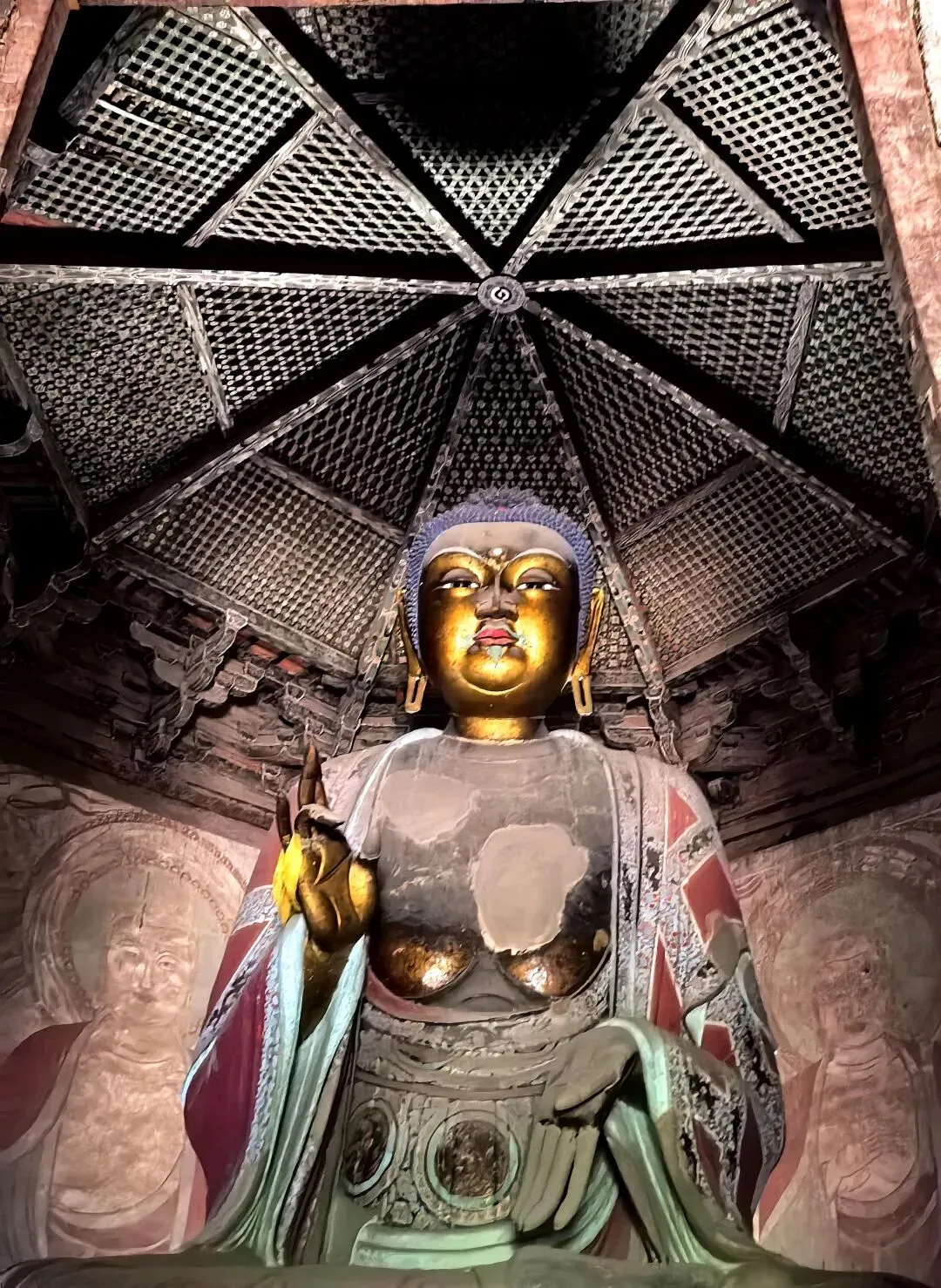 2⃣现在只能看外观,跟第一层,唯一开放内部参观的楼层,看点是11米高的辽代释迦牟尼佛像,壁画也保留的挺好,不能用闪光灯拍照