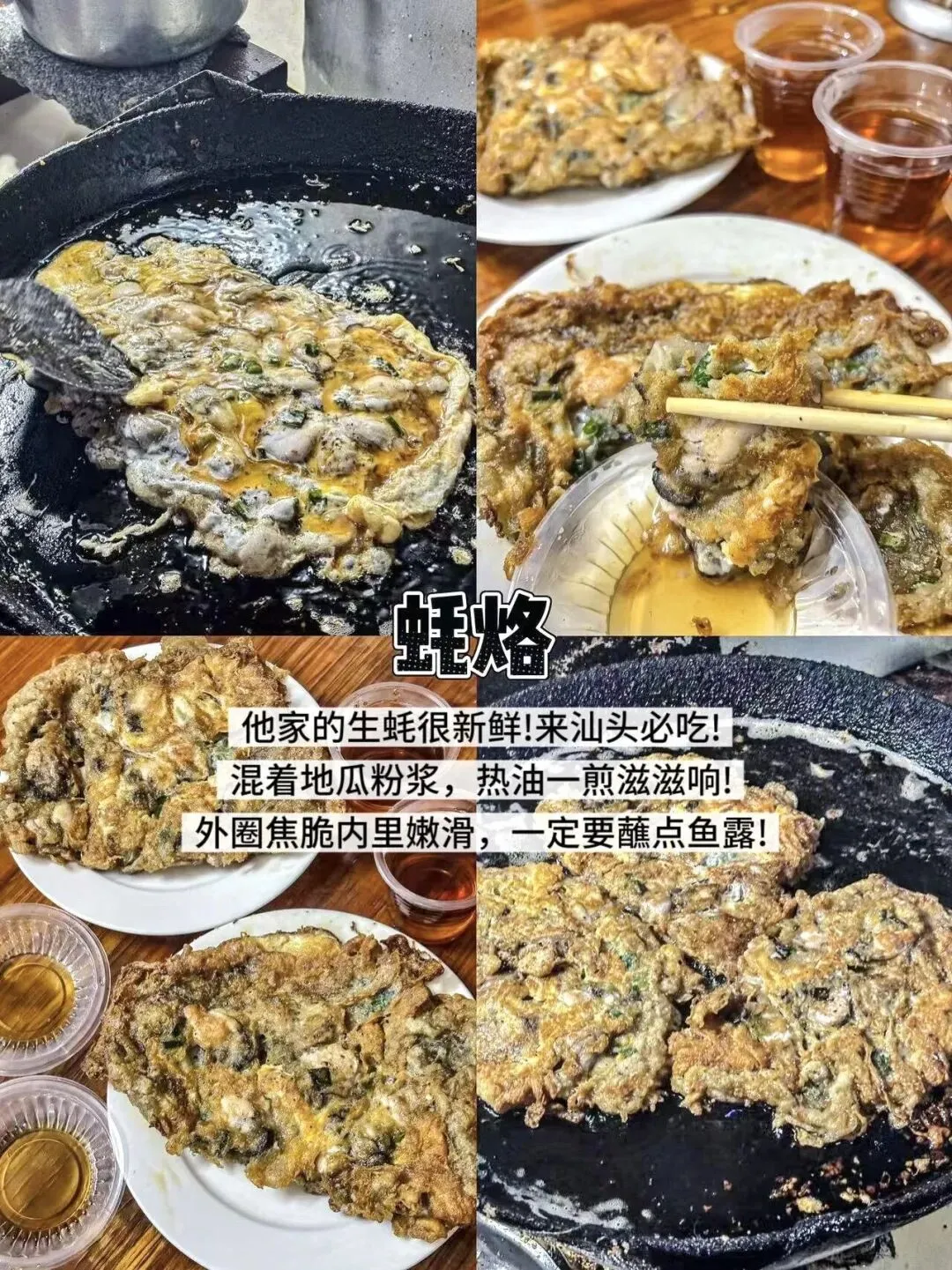 他家的生蚝很新鲜,混着地瓜粉浆,热油一煎滋滋响,外圈焦脆内里嫩滑,一定要蘸点鱼露!