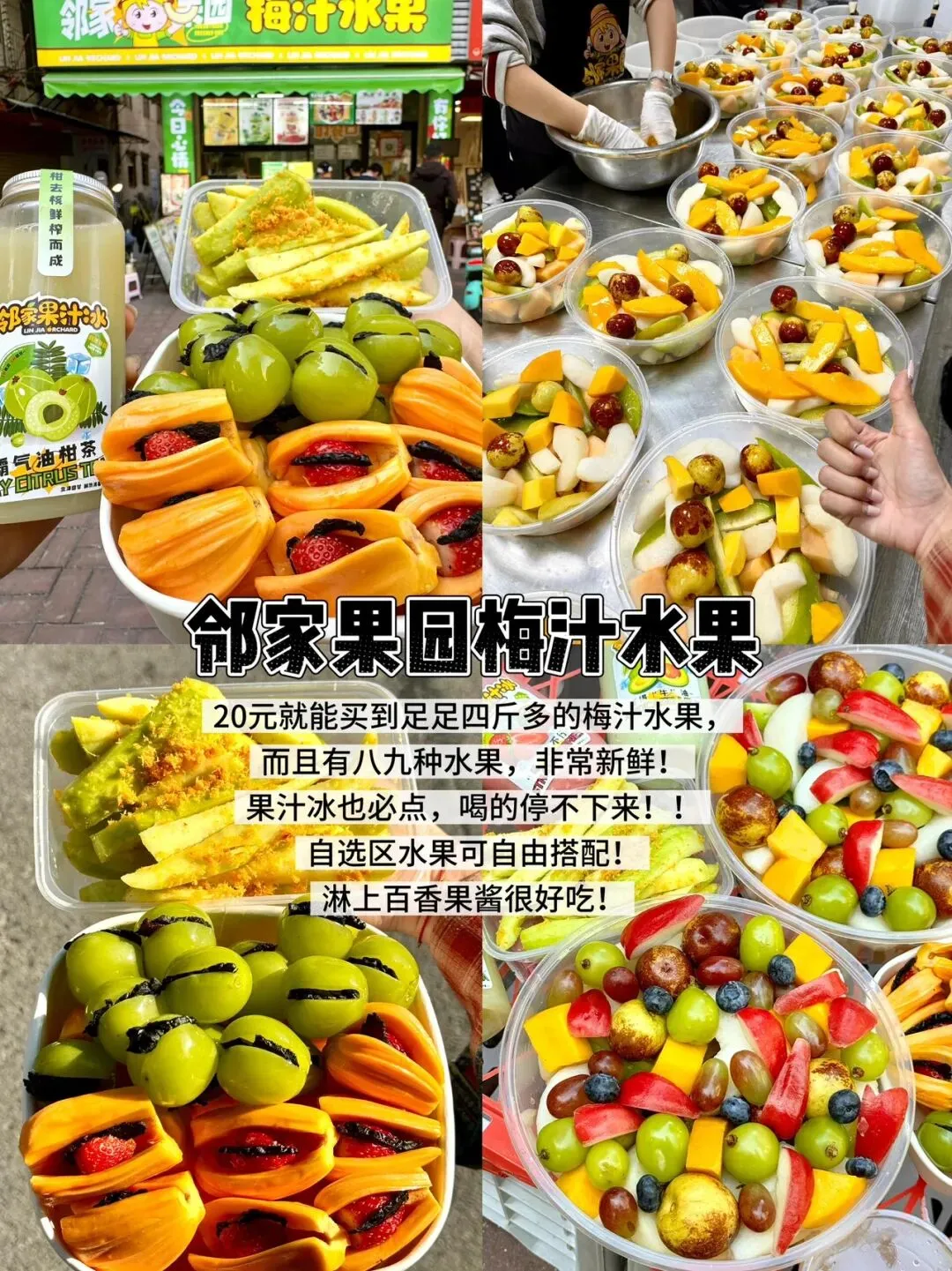 20元就能买到足足四斤多的梅汁水果,而且有八九种水果,淋上百香果酱很好吃!