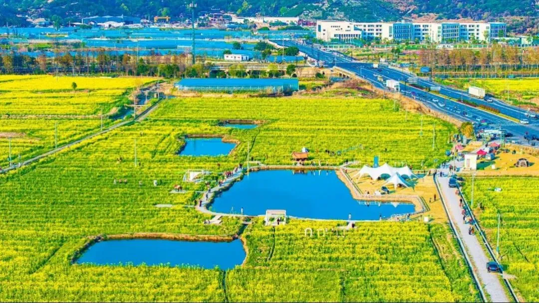 茅洋青创共富农场的百亩油菜花海是春日核心景致,花开时金黄花浪连绵铺展,与远山、村落、蟹钳港相映成绝美田园画。