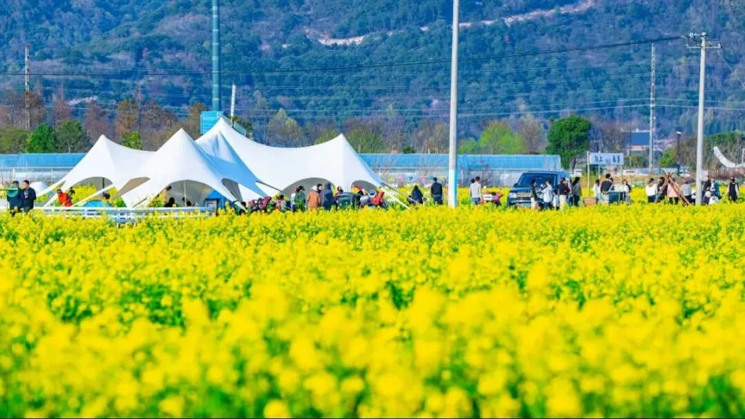 离象山城区最近的油菜花田,一脚油门就能抵达的“莫奈花园”。花田旁临湖而建,布置了超多网红打卡装置,还贴心配备天幕休闲区。