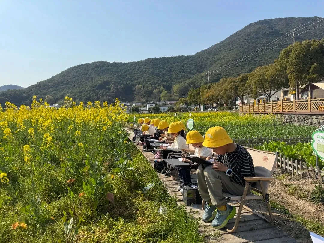 黄避岙乡高泥村成片油菜花竞相绽放、流香溢彩,花田化身天然的自然课堂,吸引众多小朋友前来研学、写生,用画笔定格春日美好。
