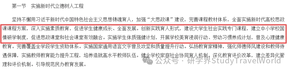 纲要共分为18篇。关于“研学”,纲要还提出“创新实践育人形式,建设大学生社会实践专门课程,建立中小学校国情研学制度,促进思政课堂和社会课堂有效融合。”