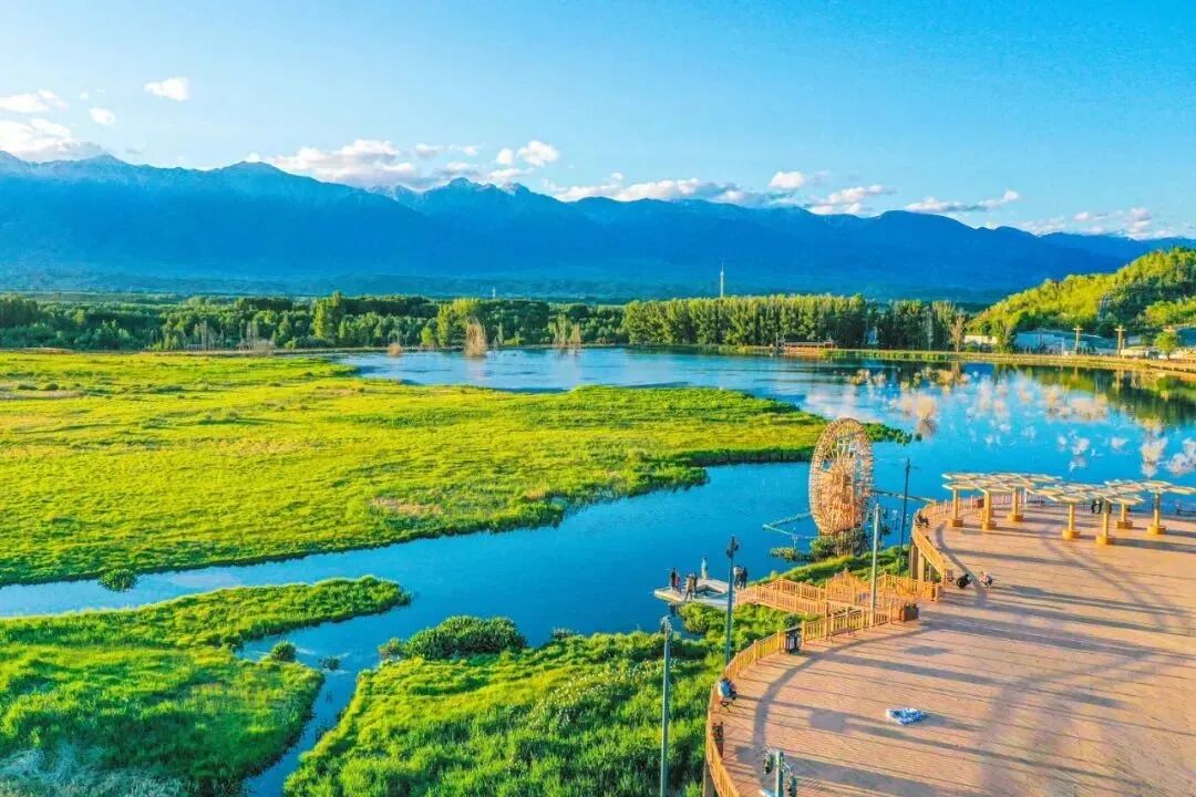 这里浓荫蔽日,清风送爽,夏季平均气温远低于城区,是天然的避暑康养胜地。沿着河谷绿道缓步而行,掠过成片的沙棘林与葱郁的河柳带,湿地碧波荡漾,远山雪峰隐约可见,清凉的水汽裹挟着草木清香扑面而来。徒步寻幽,骑行逐风,无需奔赴远方,就能在这方秘境里,邂逅夏日最惬意的清凉与安然。