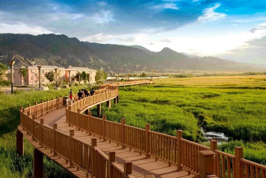 距县城仅3公里的民俗体验地,充满察哈尔蒙古族风情。村寨里家家户户的院墙都绘有精美的民俗墙画,讲述着西迁的历史;登上木质瞭望塔,可俯瞰湿地与村寨全景。在这里,你可以住进蒙古包,参加热闹的篝火晚会,品尝现烤羊肉串与咸香奶茶,逛乡村集市,深入体验卡伦戍边文化。