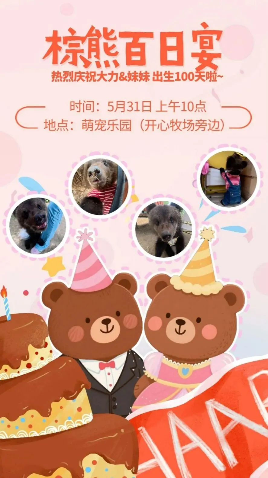 萌宠助阵:5月31日上午10点,棕熊“大力”和“妹妹”百日宴,近距离与明星动物宝宝们庆生。