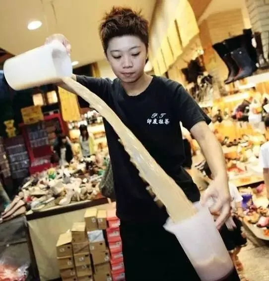 拉茶又被称为:"飞茶",是用两个杯子拉来拉去,拉得越长,起泡越多,味道就会越好,是人们最喜爱和饮用最普遍的含茶饮料。