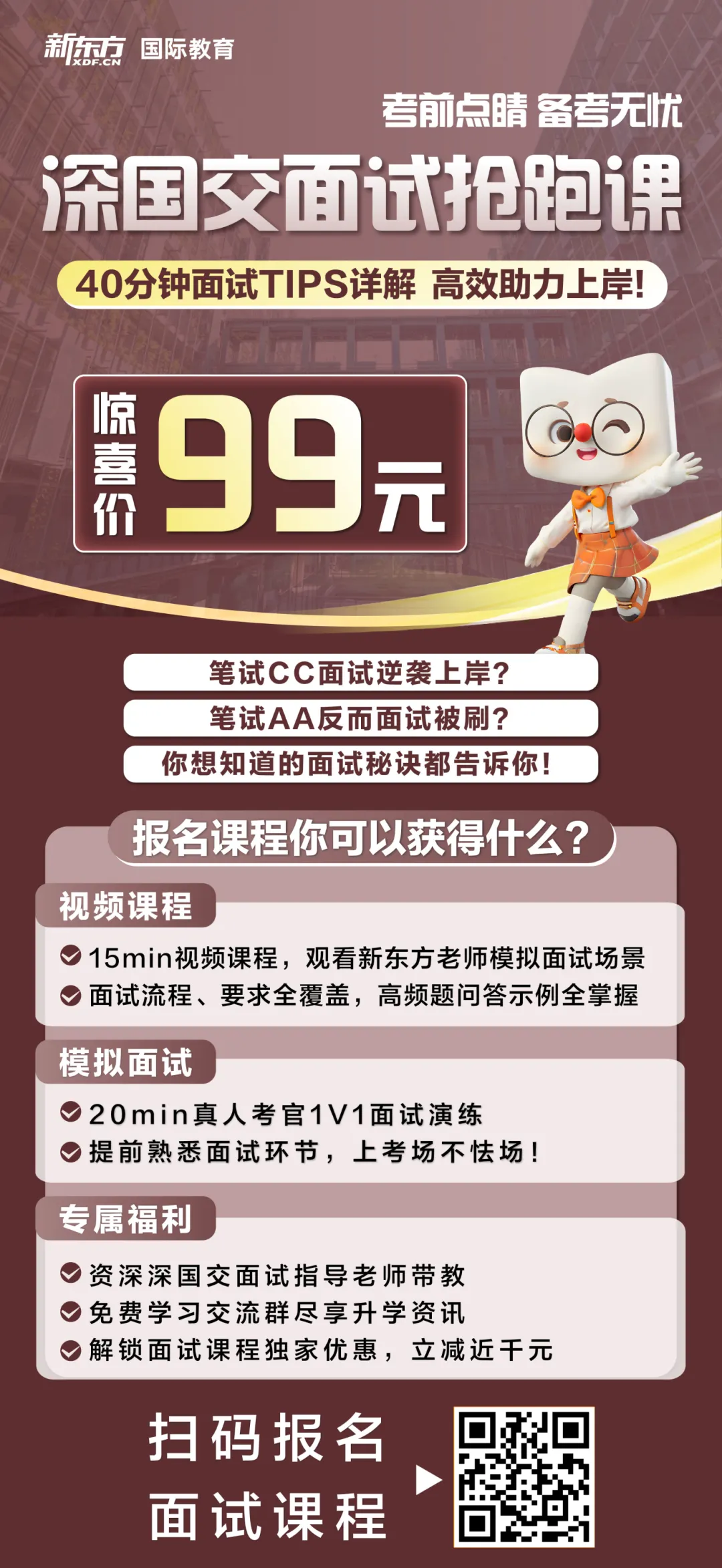 想顺利上岸,一是看笔试成绩,另一个重要的事情就是面试了!毕竟,之前有不少学生都存在,笔试考得不错,但是面试环节被刷下来的情况!为了让考生们提前清楚自己的全英文面试能力,我们新东方国际教育推出【深国交面试抢跑课】内容包含: