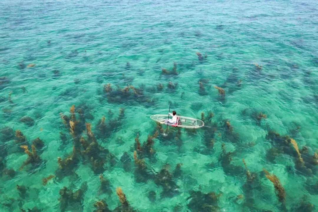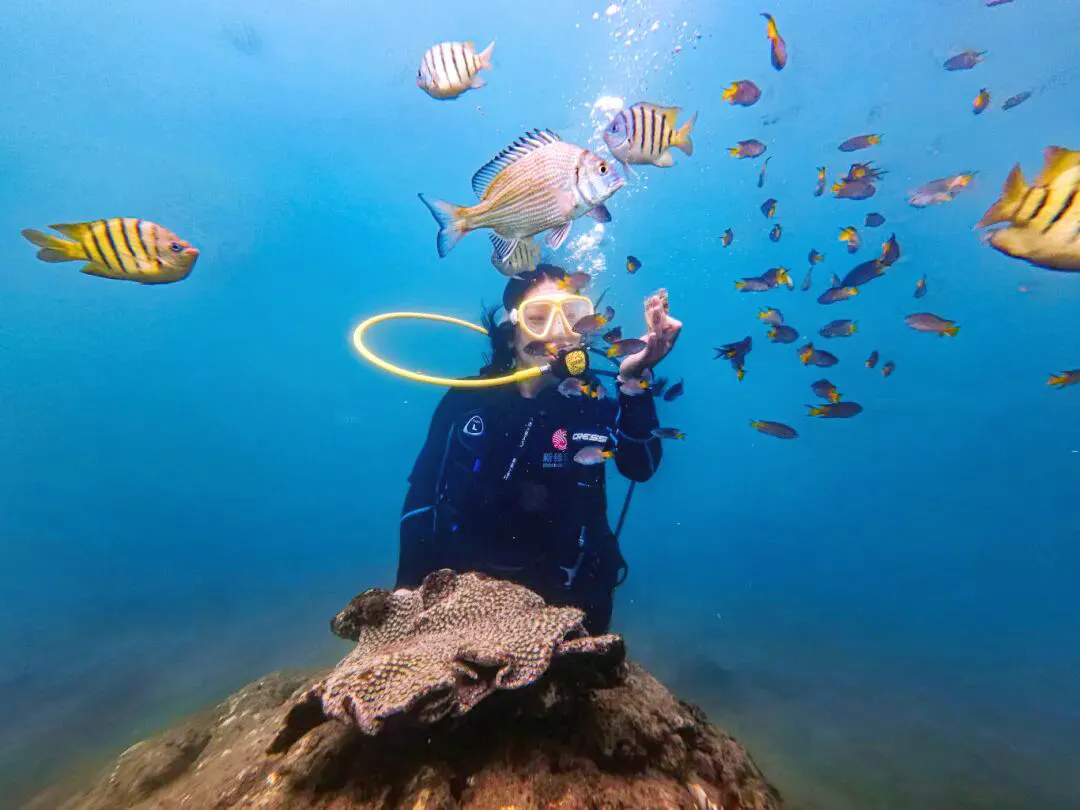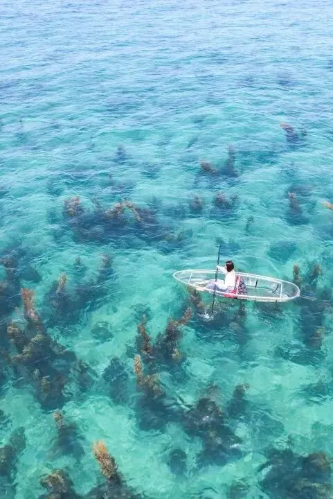 乘船上蓝桥附近,低头就能看见海底摇曳的马尾藻、穿梭的小鱼,连船桨划过的痕迹都清晰可见,仿佛伸手就能进入海底世界。