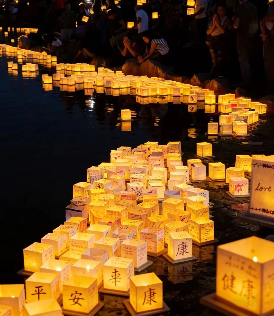 等到每天17:30日落时分,在浮桥会有一场温柔的放灯仪式。大家在水灯上写下祝福,数百盏水灯随波轻漾,烛光映着晚霞,汇成“灯海共长天一色”的诗意场景,思念也随着海浪漂向远方。