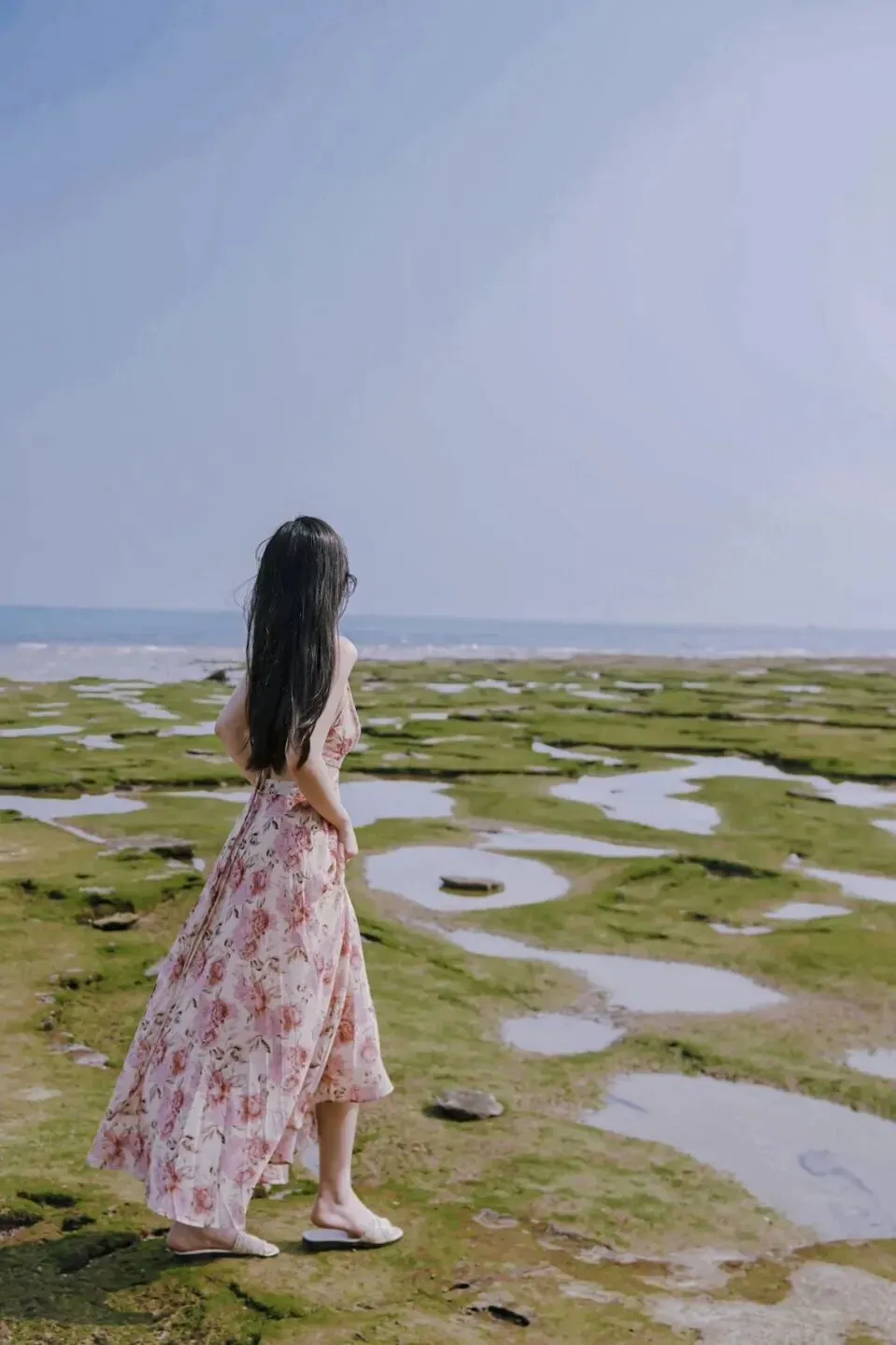 退潮后,海蚀平台上布满水洼,晨光照下来,水面和石头都泛着微光,黑色火山岩上长着翠绿青苔,海水冲刷出的纹路,每一处都是自然的杰作。